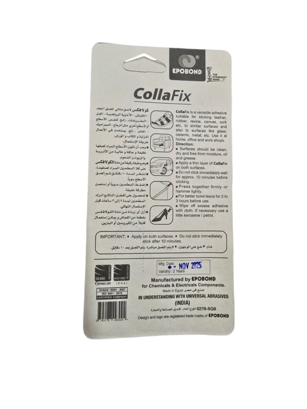 لاصق متعدد الاستخدامات: يُعدّ لاصق EPOBOND CollaFix لاصقًا متعدد الأغراض مناسبًا لربط الجلد والمطاط والريكسين والقماش والفلين والمواد المماثلة، بالإضافة إلى الأسطح الزجاجية والخزفية والمعدنية للاستخدام المنزلي والمكتبي وفي ورش العمل.